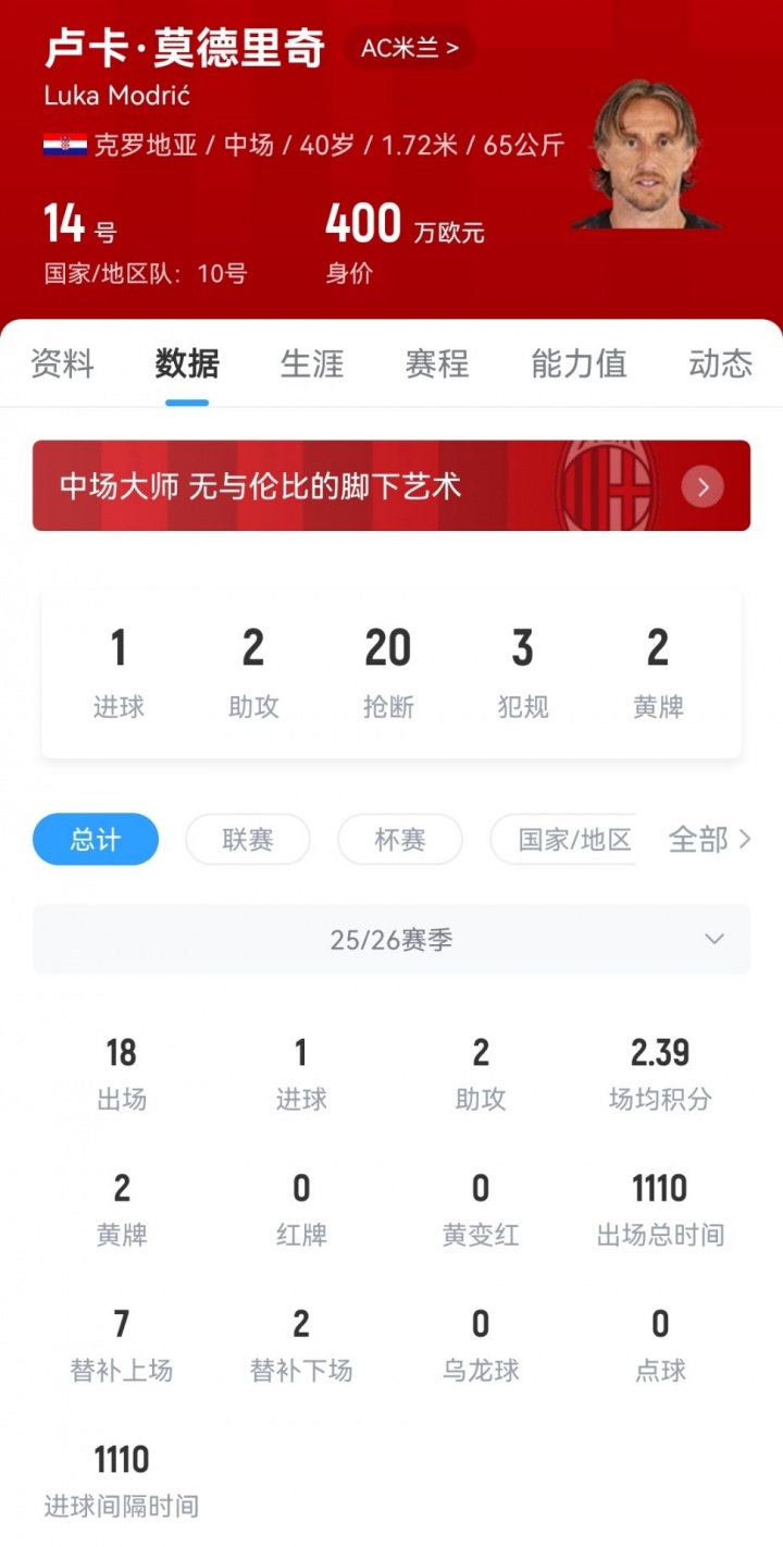 本赛季意甲11轮比赛,莫德里奇全部首发出场,且只有两次被换下,为球队贡献了1球2助攻。而米兰在联赛首轮不敌克雷莫内塞后,就没尝过败仗,目前6胜4平1负排在意甲第3位。